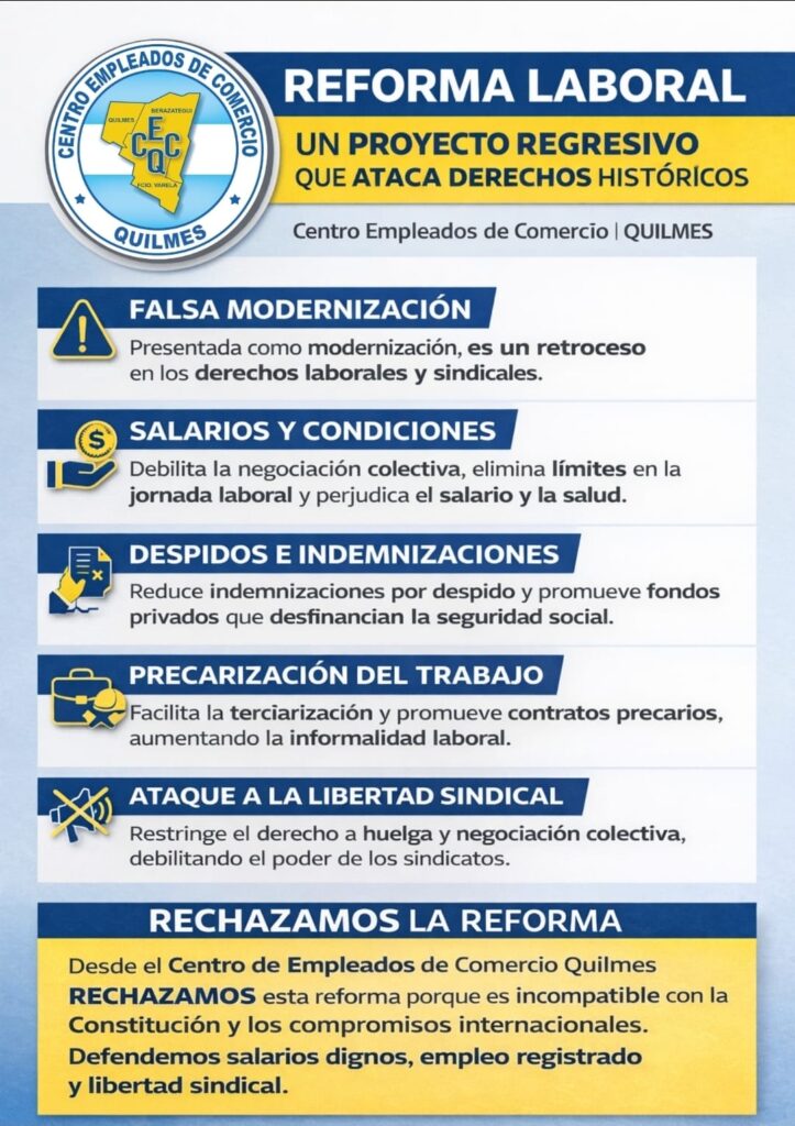 Desde el Centro de Empleados de Comercio de Quilmes expresamos nuestro firme rechazo al proyecto de Reforma Laboral impulsado por el Poder Ejecutivo Nacional.