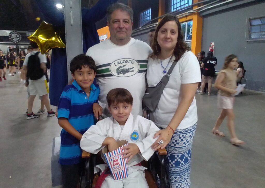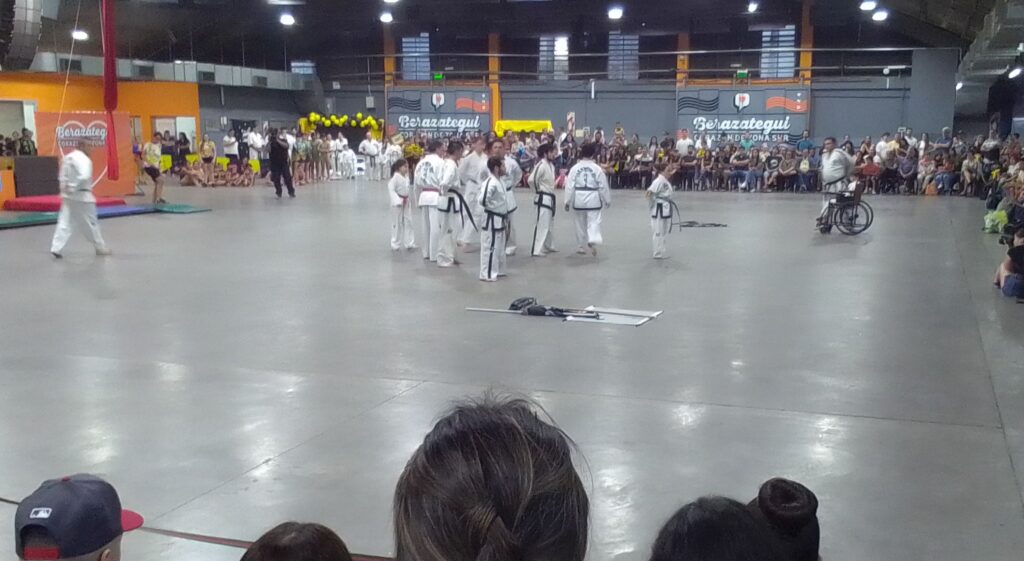 La ceremonia comenzó con una exposición de lo aprendido: Primero fueron las chicas del patín; luego, acrobacia en telas; taekwondo incluyó a un nene de 7 años en silla de ruedas; el patín regresó con las señoras del club seguidas por las más chicas y por otras acróbatas sobre colchonetas.