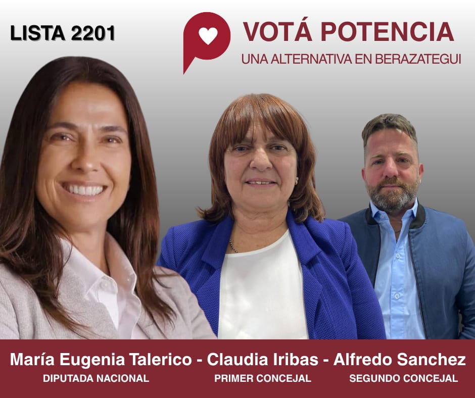 Claudia Iribas, cabeza de lista en Berazategui, expresa que desde la cercanía que le toca vivir junto a las más difíciles realidades con los vecinos, y conociendo en profundidad el entramado de desidia y corrupción del gobierno provincial, explicita el pedido a los vecinos, buscando el apoyo electoral hacia María Eugenia Talerico e invitando a sumar la mayor cantidad de votos de confianza para el domingo 7 de septiembre invitando a votar la lista 2201 de la Alianza Potencia.