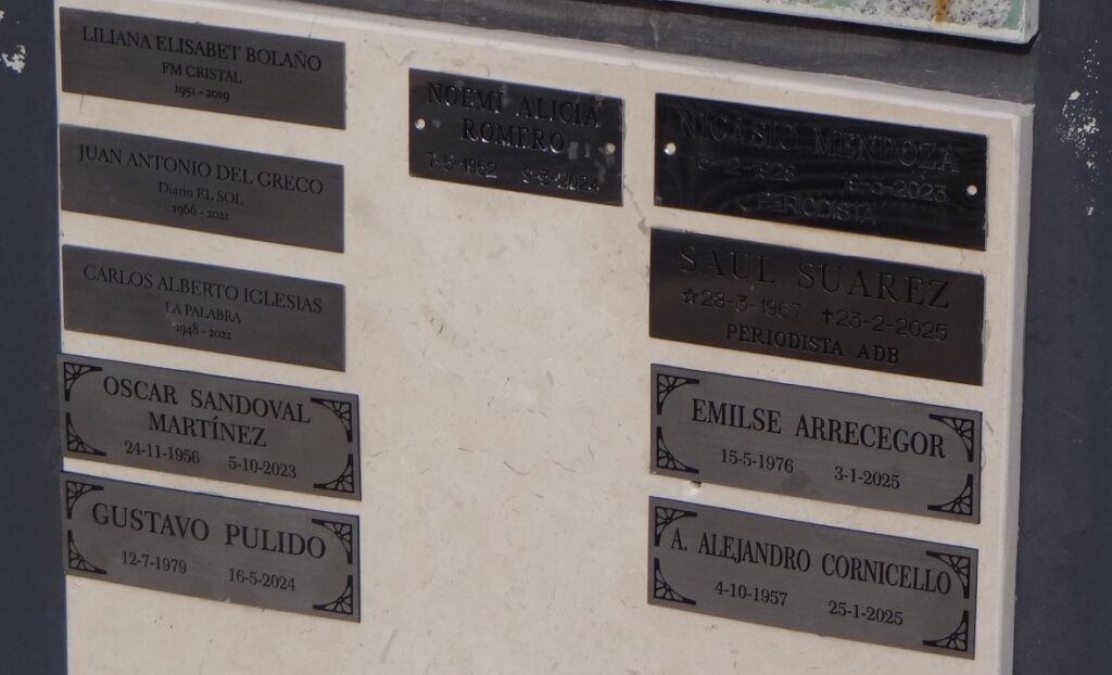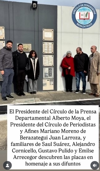 Las nuevas placas fueron para Saúl Suárez (ADB), Oscar Sandoval Martínez (La Torre de las Palabras), Gustavo Pulido (presidente del Círculo de la Prensa), Emilse Arrecegor (FM Sur/OK) y Alejandro Cornicello (FM Espacio/Wen). De cada uno de ellos, familiares y allegados hablaron con sentidas palabras.
