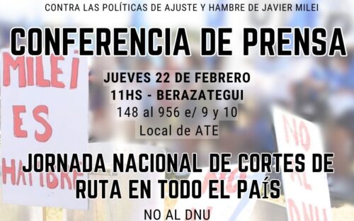 Este jueves 22 de febrero a las 11 en Berazategui, diferentes movimientos sociales realizaremos una conferencia de prensa para anunciar un plan de lucha nacional contra el ajuste.