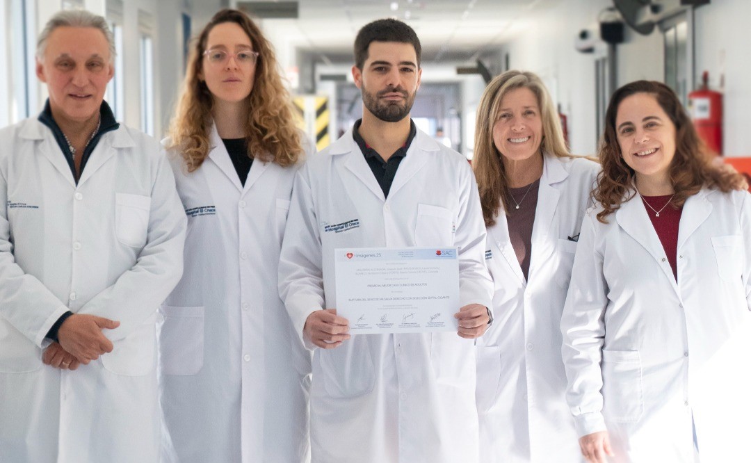 Joaquín Malbrán Alconada, Viviana Paskevich, Norberto Blanco, Celeste D’Orto y Graciela Reyes ganaron el Premio de la Sociedad Argentina de Cardiología al mejor caso clínico de adulto por su trabajo Ruptura del seno de Valsalva derecho y aneurisma septal gigante.