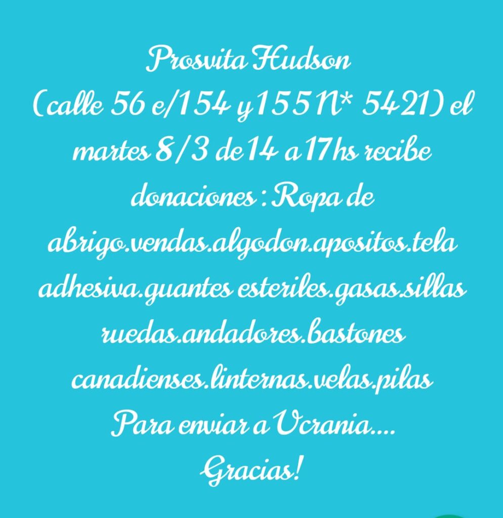 El martes de14 a 17, en Prosvita Hudson (56 y 154), recibirán las donaciones para Ucrania.