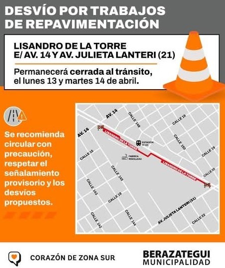 Desviarán el tránsito para hacer obras en Lisandro de la Torre entre las avenidas 14 y 21, para repavimentar. Desde las 8 de este lunes 13 de abril y hasta que terminen, la Diagonal Lisandro de la Torre (lado Oeste) entre las avenidas 14 y Julieta Lanteri (21) permanecerá cerrada. En pos de no interferir, el Municipio recomienda circular con precaución, respetar el señalamiento provisorio y los desvíos propuestos.