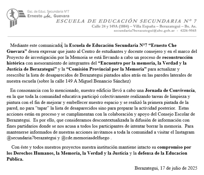 La Escuela de Educación Secundaria 7 Ernesto Che Guevara desea expresar que junto al Centro de Estudiantes, docentes y consejeros, en el marco del Proyecto de Investigación por la Memoria se está llevando a cabo un proceso de reconstrucción histórica con asesoramiento de integrantes del Encuentro por la Memoria, la Verdad y la Justicia de Berazategui y la Comisión Provincial por la Memoria para actualizar y reescribir la lista de desaparecidos de Berazategui pintados años atrás en las paredes laterales de nuestra escuela (sobre la calle 149 A Miguel Benancio Sánchez).