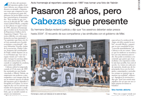 A 28 años del asesinato del reportero gráfico José Luis Cabezas, sus compañeros reivindicaron su ejemplo y lamentaron tener que comparar los ataques a la prensa por parte del gobierno de Javier Milei con los que caracterizaron al menemismo. “Esto reedita lo que vivimos en la década del ‘90”, reflexionó Gabriel Michi, compañero de Cabezas en aquel verano de 1997, durante el homenaje que se realizó en la sede de la Asociación de Reporteros Gráficos de la Argentina (ARGRA). “Son contextos difíciles, en cada manifestación nos han reprimido” y “no queremos que haya otro José Luis asesinado por el poder económico concentrado”, destacó Sebastián Vricella, titular de ARGRA. Gladys Cabezas, hermana del ex trabajador de Perfil, señaló durante un acto en Pinamar que “nos van a seguir viendo acá” todos los años “porque los asesinos deberían estar presos hasta 2034, cuando se cumpliría la condena, pero están todos libres”.