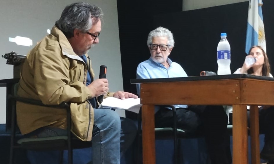 El editor Néstor Arias leyó hasta donde pudo el discurso que había pronunciado en septiembre de 2006 en ocasión de una publicación. Ante la emoción, pidió ayuda a Adrián Ruiz para que lo asistiera.