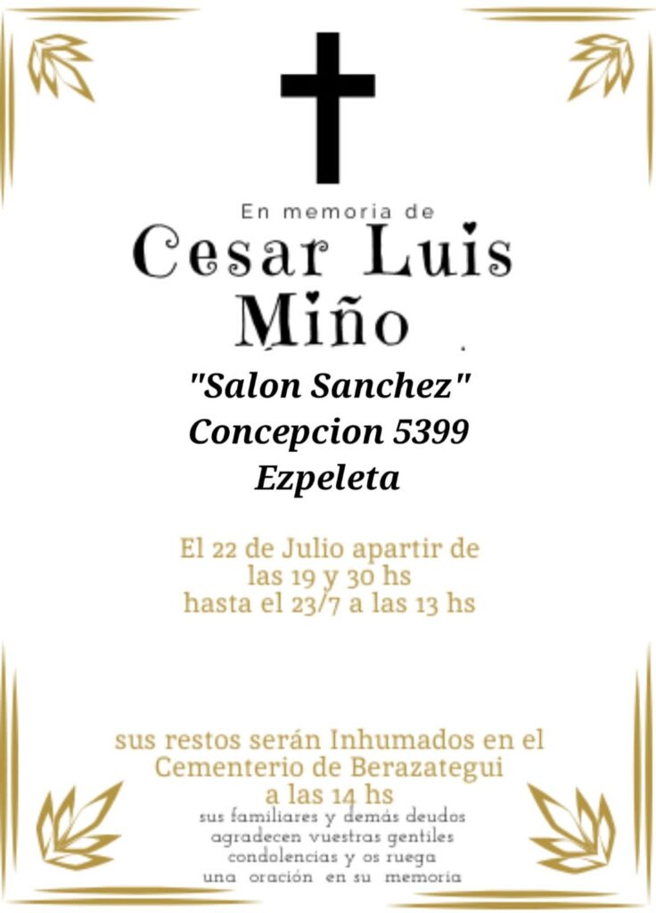FM Cardinal comunicó el fallecimiento de César Luis Miño productor de Cambalache. Estaba internado en terapia intensiva. En un viaje en un auto de aplicación había perdido su DNI, cuya devolución su hija estaba pidiendo, según informó a este CIB su colega de FM Aníbal García. Es velado en Ezpeleta hasta este miércoles:
