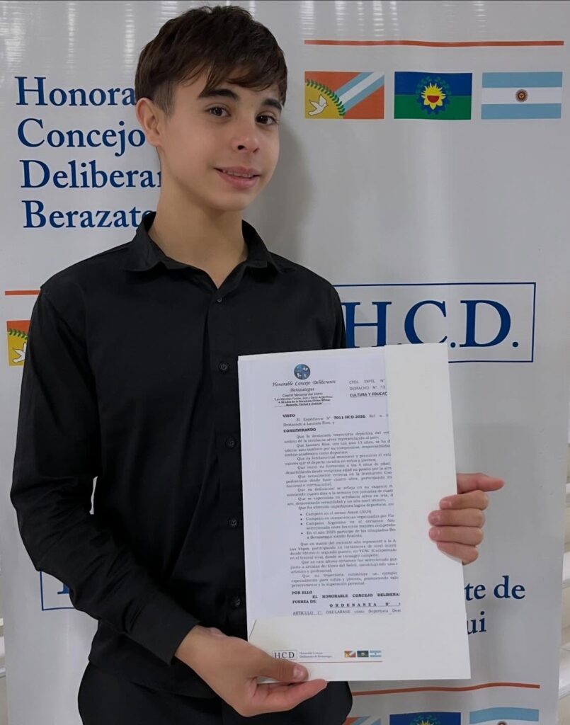 (CIB) Los concejales de Berazategui entregaron un reconocimiento como deportista destacado a Lautaro Joel Ríos, el adolescente que destaca en acrobacia con telas en el orden internacional.