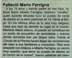 Falleció Mario Alberto Ferrigna (79 años), histórico «canillita», informó en sus redes Jorge Tronqui, allegado a quien durante décadas tuvo su puesto de venta de diarios en la semi peatonal de 14, frente al Bingo. En los últimos años se lo veía muy flaco, hasta que dejó de atender el puesto donde está otra persona.